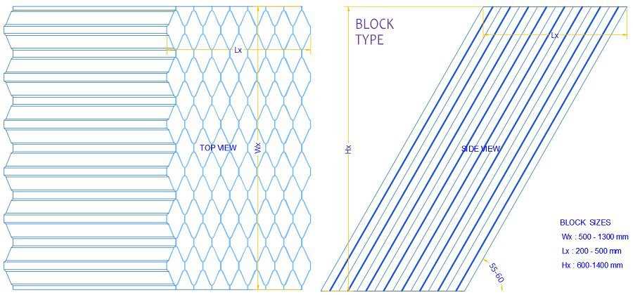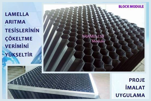 Su ve atıksu arıtma tesislerinin durultucu havuzlarında kullanılan Blok tip lamella üst ve yan göürünüşü yukarıda verilmiştir.