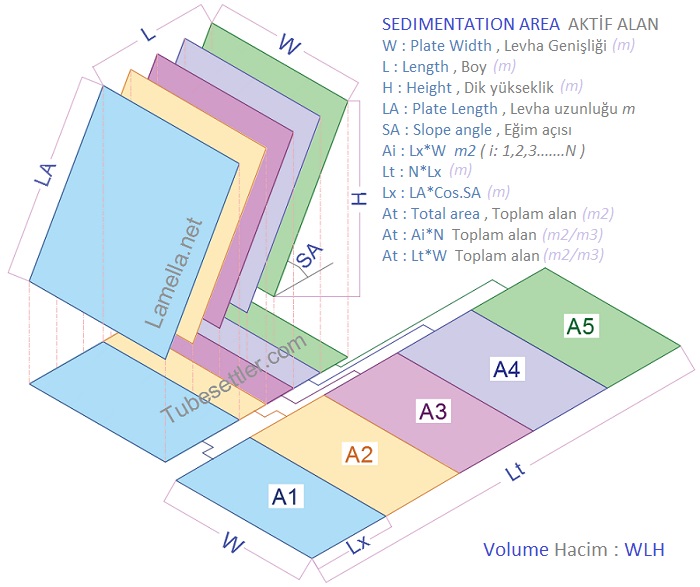 A60 : 60 derece eğimle yerleştirilen 1 m³ lamellanın oluşturacağı etkili aktif alan ( Sedimentation Area ) dır.